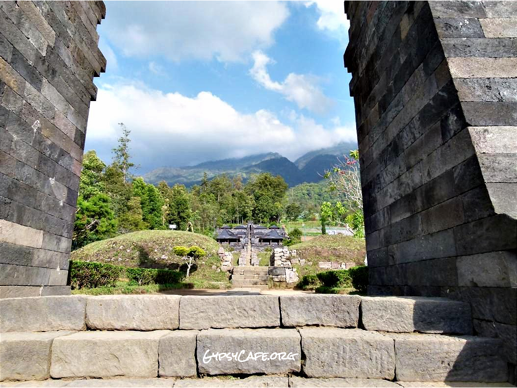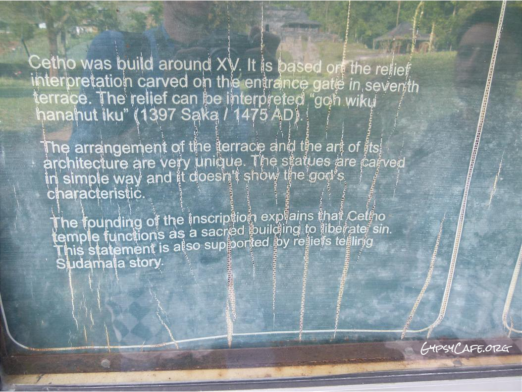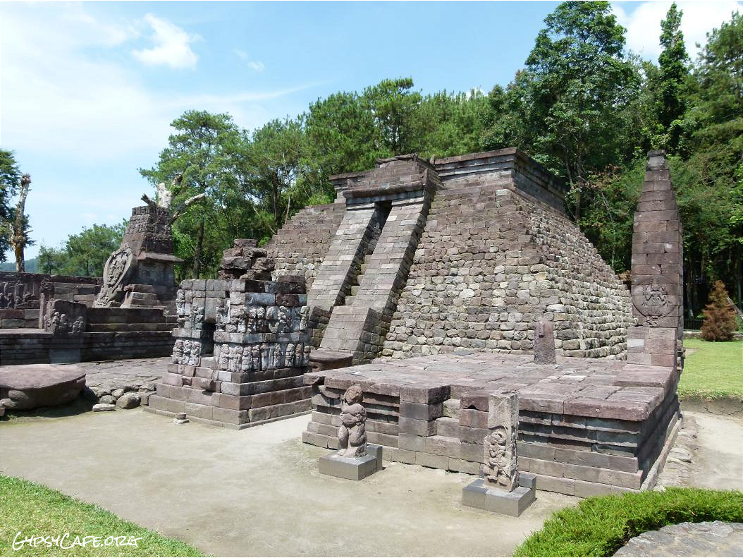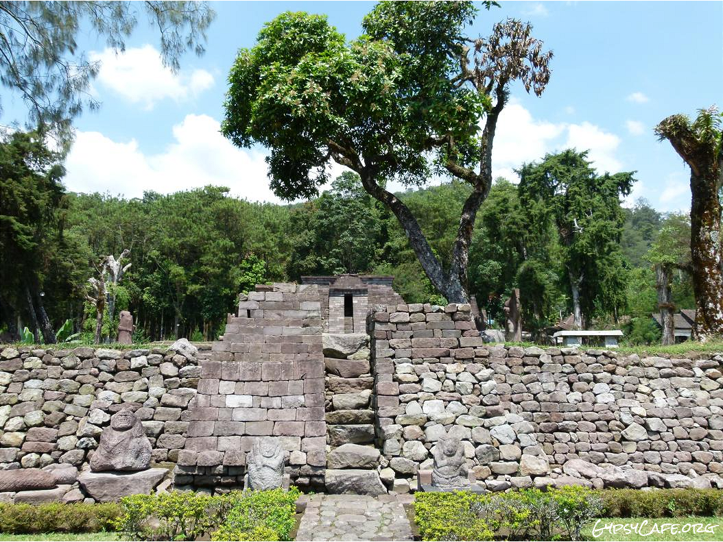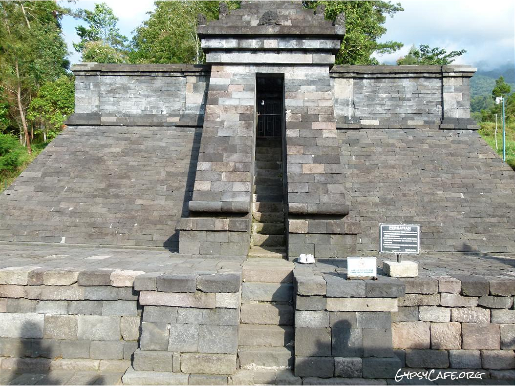 The site is on the western slopes of Mount Lawu in Central Java, situated at about 910 m above sea level (3,000 f). The monument was built around the 15th Century (est era: 1429 – 1446). Facing West, it consists of three levels which symbolize some of the levels for attaining perfection in life. Some reliefs explain the existence of three worlds (levels of life); the underworld, the middle world and the above world. The three worlds depict the levels humans must pass to go to Nirvana.