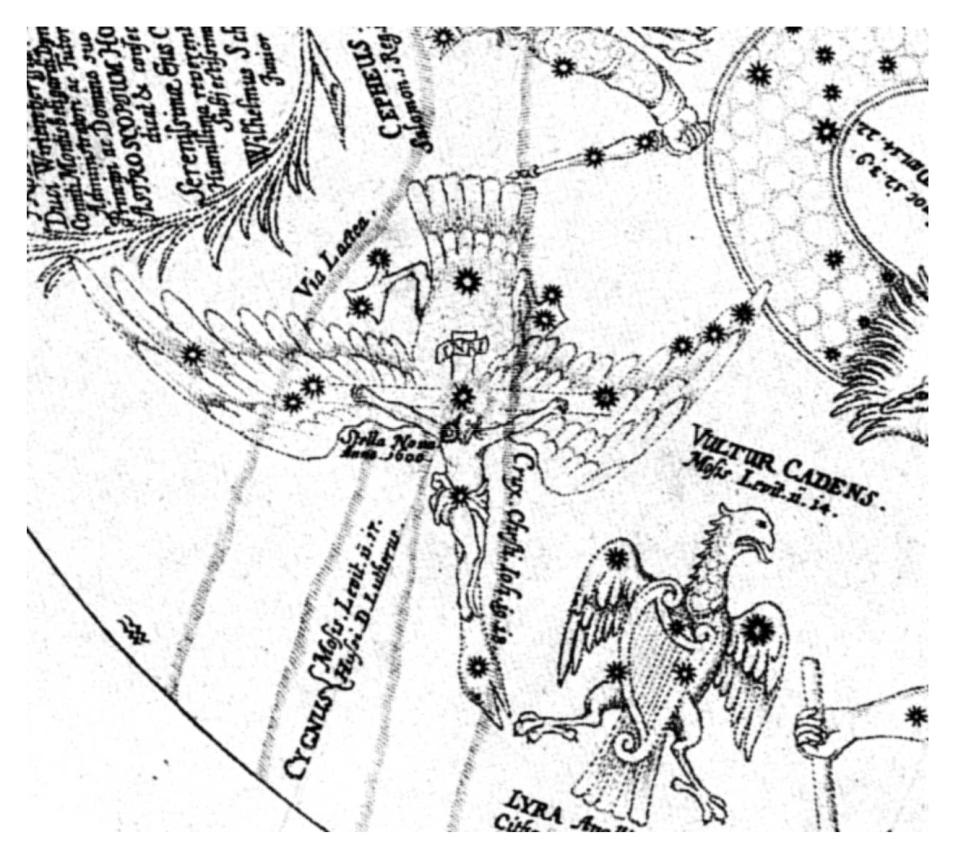 In illustrated planispheres from the seventeenth century onwards, Cygnus is shown sometimes as Christ on the Cross, with six of the asterism’s most prominent stars corresponding perhaps to the approximate positions of the Crown of Thorns, the three nails in Jesus’s hands and feet, the wound in his thigh made by the lance, and, finally, his Sacred Heart. In fact, the identification of Cygnus with the Cross of Calvary, a symbol of death and redemption for Christians worldwide, goes back at least to AD 592. – Andrew Collins (The Cygnus Mystery). 19