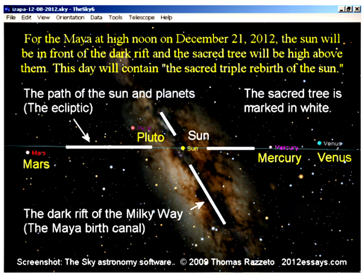 When the Hero Twins reached a crossroads in the underworld and chose the black road of Xibalba, they went along the Xibalba be, or ‘’underworld road,’’ a branch of the Milky Way [sky-tree 22] with a rift or cleft (from the Northern Cross south to Sagittarius). At the opposite side of the Milky Way, we find the ‘’white road’. Dennis Tedlock points out that the crossroads is the point where the ecliptic crosses the rift or cleft in the Milky Way – Susan Milbrath (Star Gods of the Maya). 23
